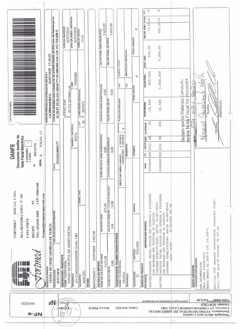 | PROTETOR FACIAL INCOLOR | 400 | R$ 12,50 | R$ 5.000,00 |