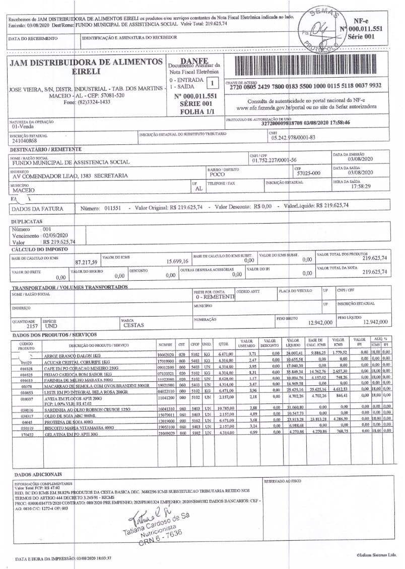 | SARDINHA | 10785 | R$ 2,88 | R$ 31.060,80 | |