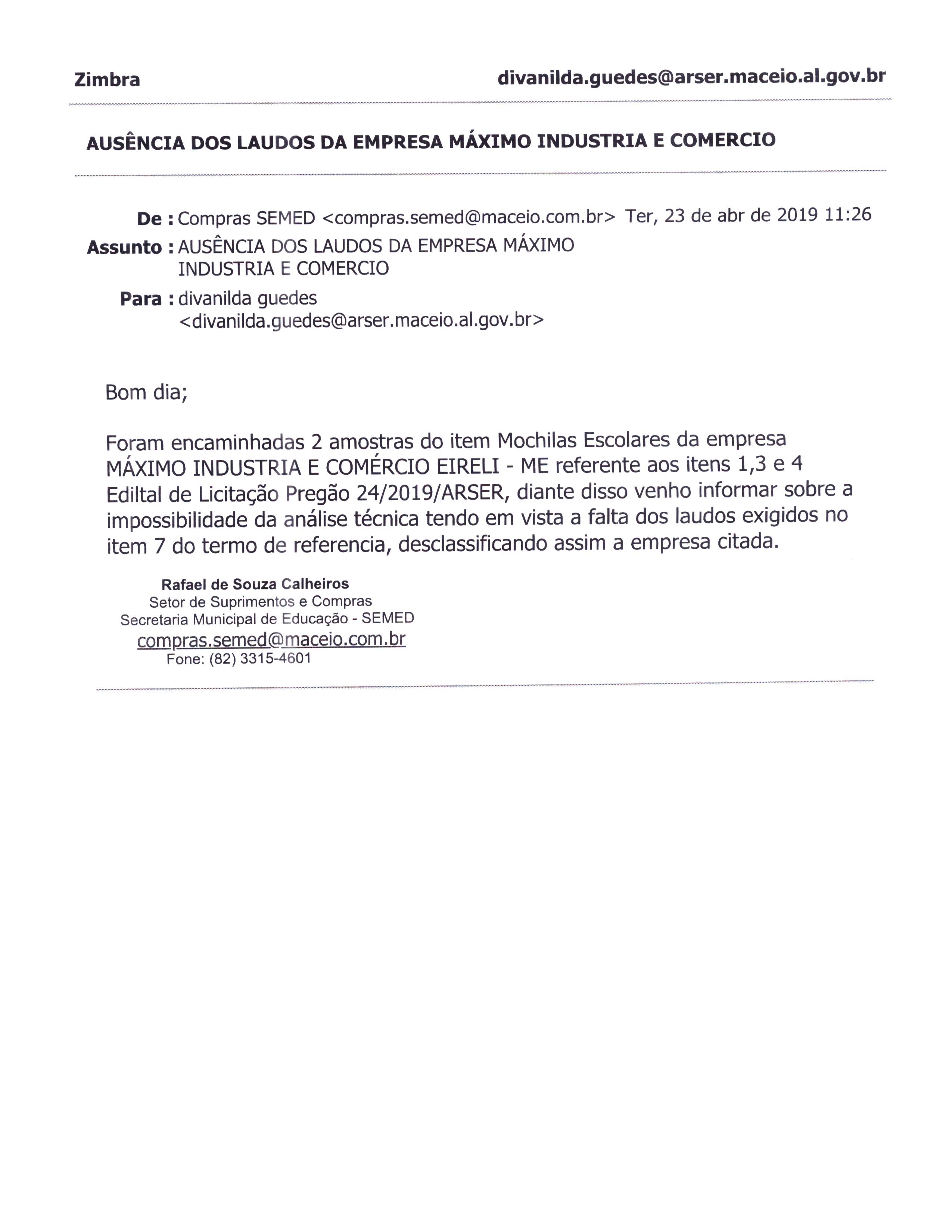 | Análise amostras | Email Empresa Máximo | 23/04/2019 | Arquivo | |
